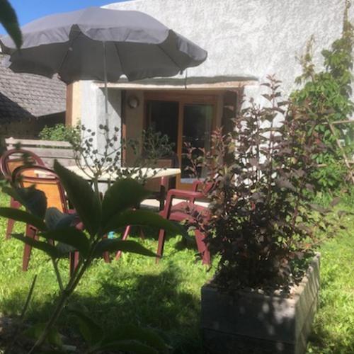 Espace extérieur non clôt, table, chaises, fauteuils et parasol
